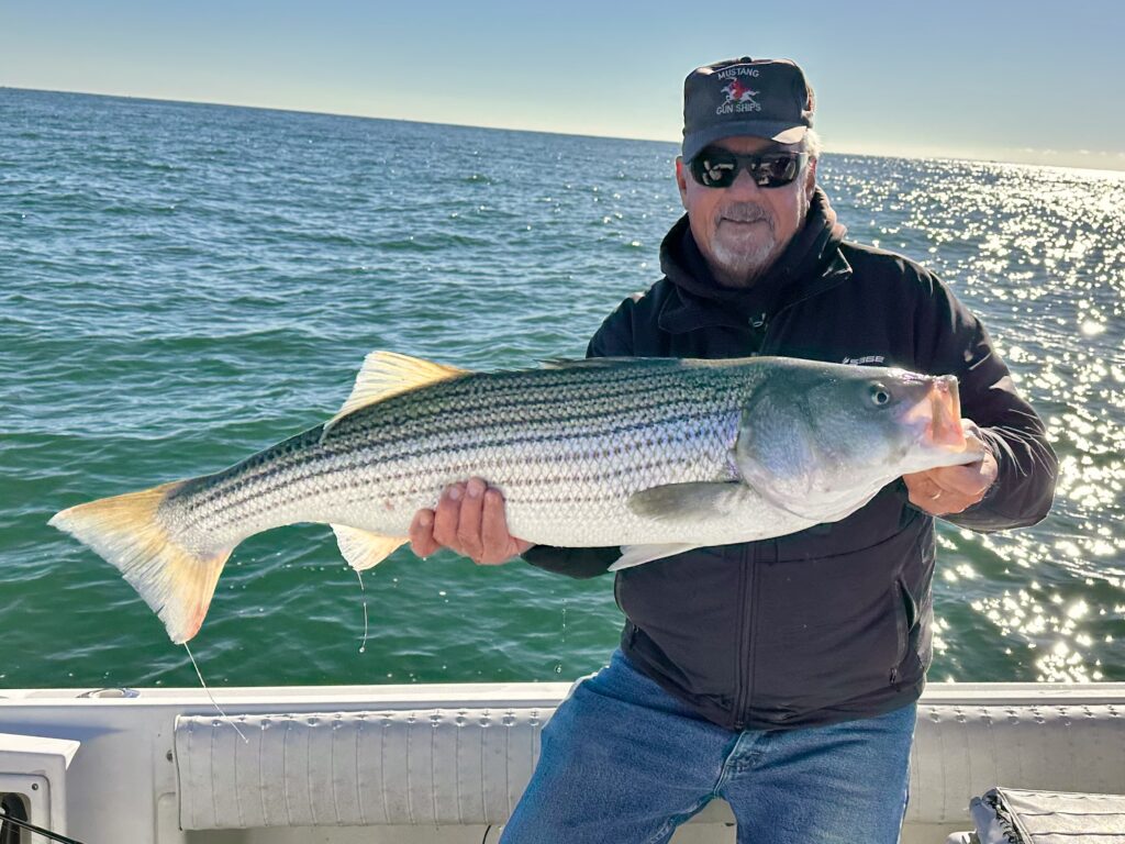 This morning the wind finally took a break so we could go for a boat ride. There were scattered fish in most places with a fleet of boats on them. We decided to look around a bit and came upon some huge splashes. I was thinking big albies or maybe some school bluefin. Wrong on both counts. They were big bass on Atlantic mackerel. I managed two big girls and Gail had some a bit smaller. It was nice to see the bedlam.